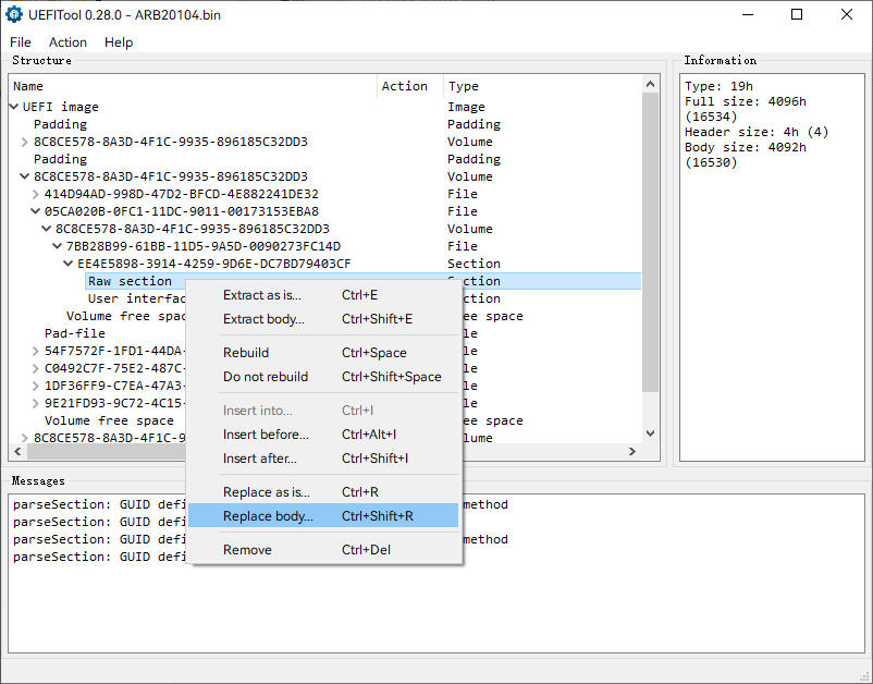 3.右键RAW Section,Replace body选择需要替换的素材,替换完成后点击左上角的File>Save image file 保存固件