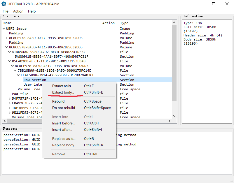 1.使用UEFITool软件打开下载好的官方bios固件,依次展开直到看见RAW Section,Extract body 导出原厂logo备份